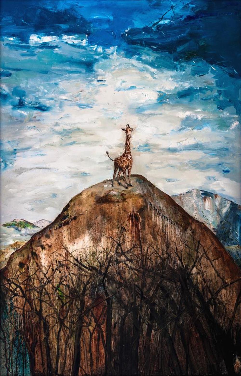我画了一只过度兴奋的跑上山头的长颈鹿,天空风云变幻,脚下乱木丛生,视觉上的创作很难说清楚具体的逻辑关系,当把一个东西抽离出本该属于它的地方所带来的荒诞感让我很感兴趣,它违背了常识却恰恰吻合了今天这个时代的交叉感给我带来的一些虚幻的东西。